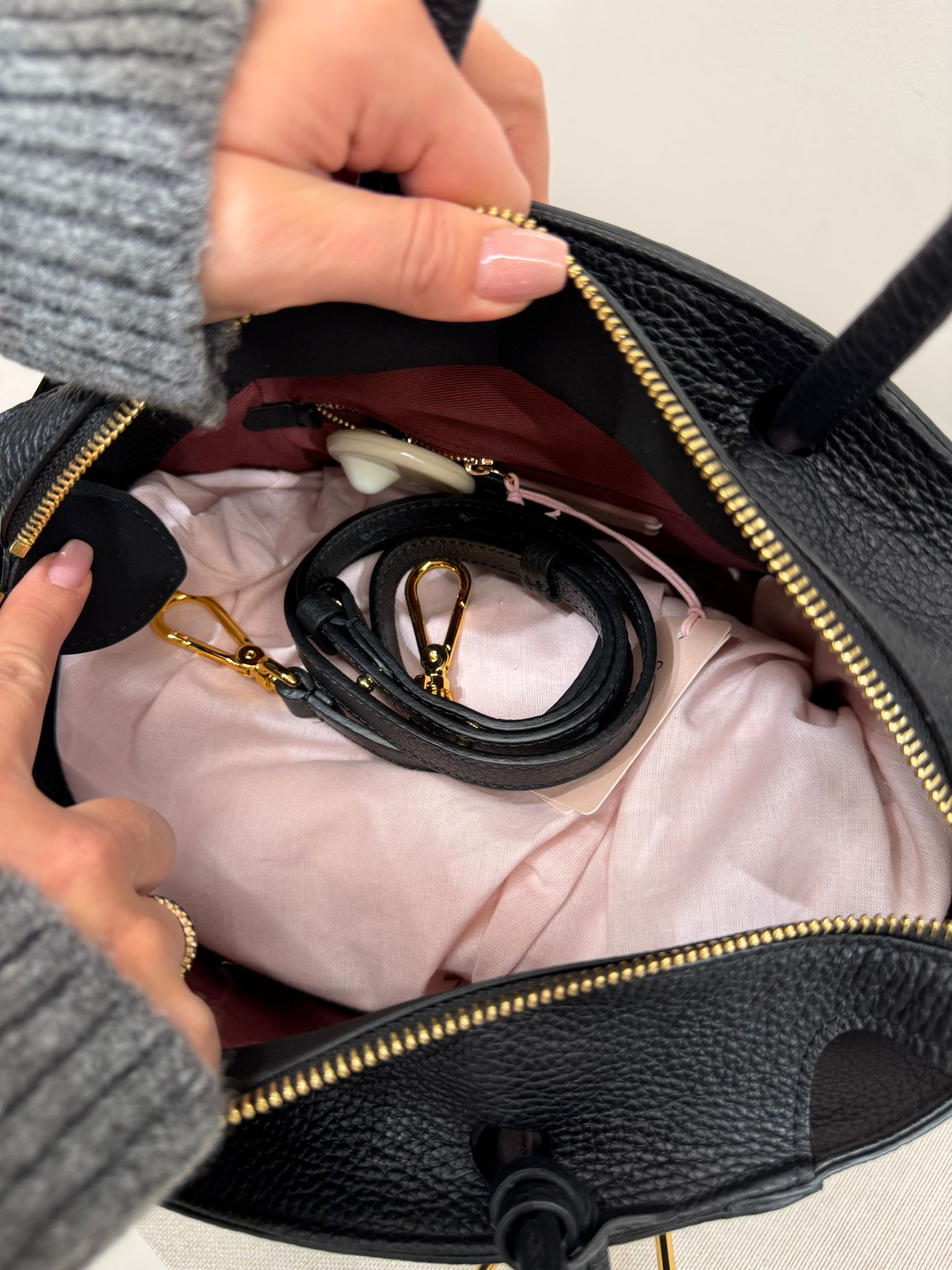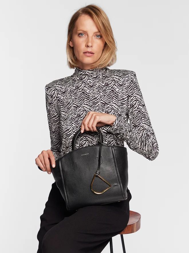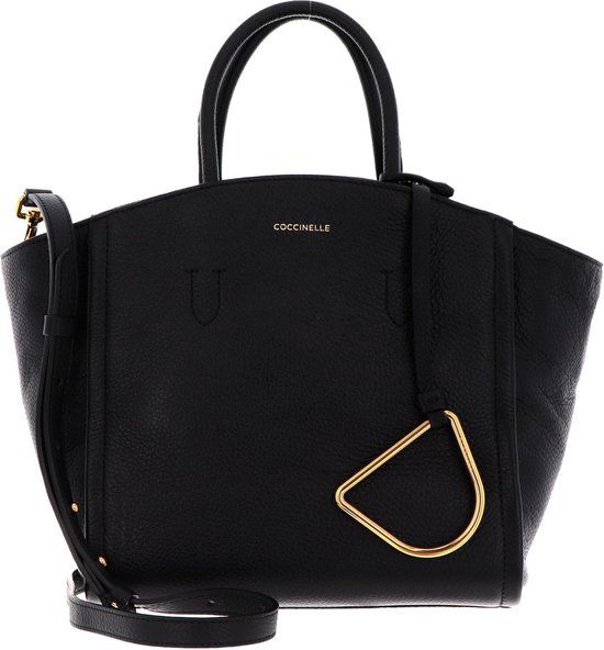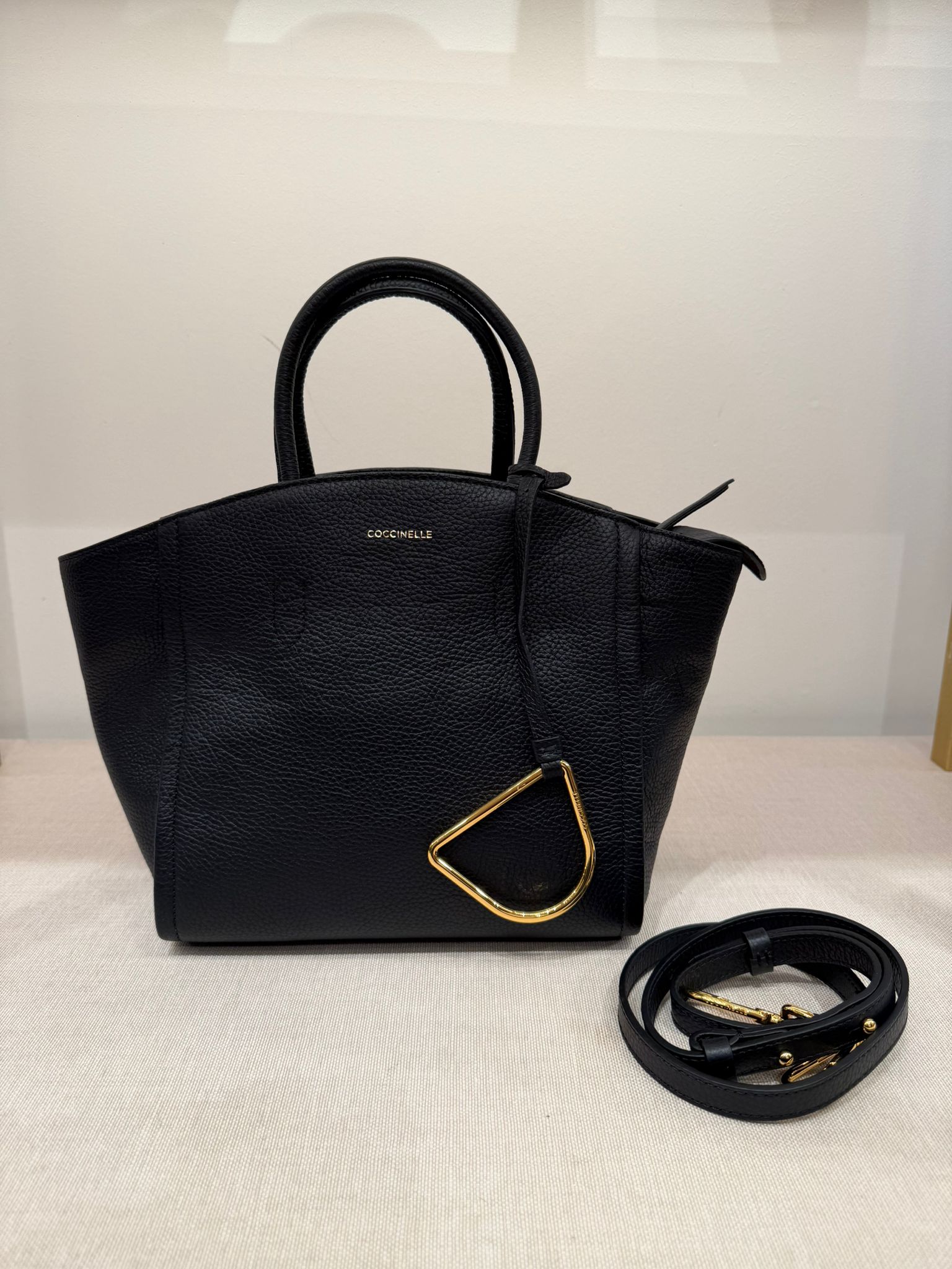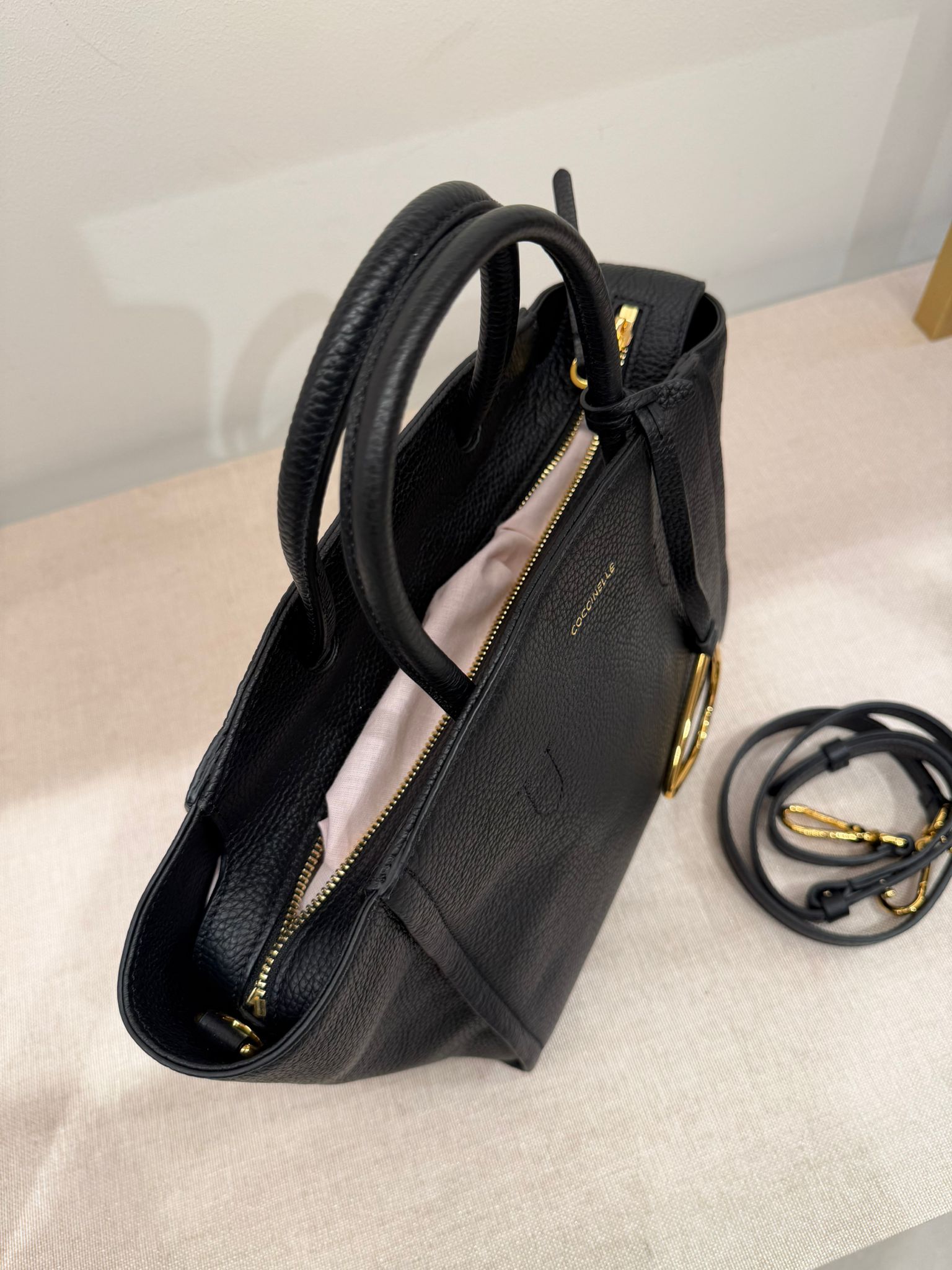 Geanta Coccinelle Narcisse neagra este o geanta de mana eleganta,confectionata din piele de vaca cu un aspect texturat.Are doua manere fixe si o bareta de umar detasabila si reglabila,un compartiment principal cu fermoar plus buzunar interior.Este o geanta spatioasa ideala pentru uz zilnic cu un design deosebit si calitate premium.
