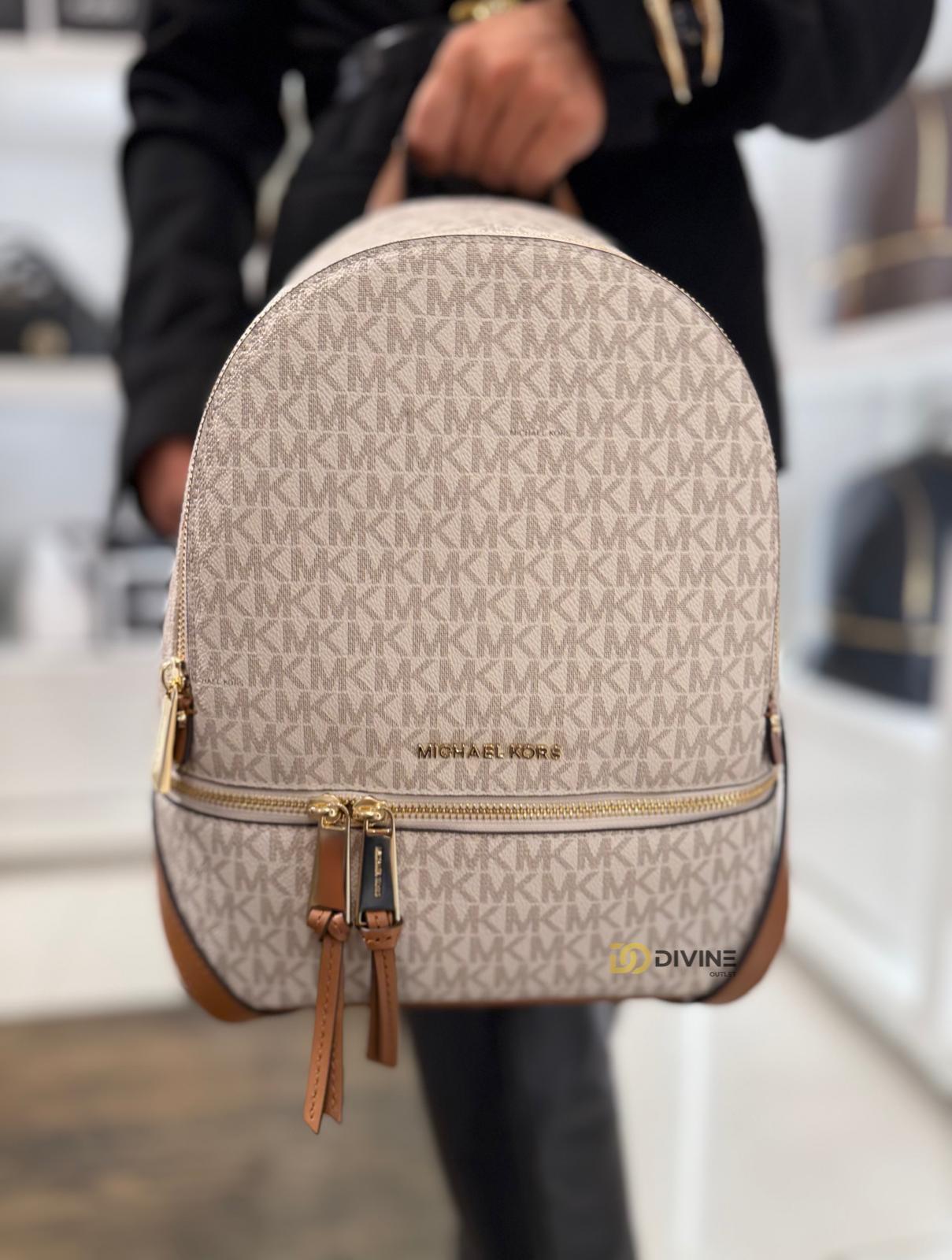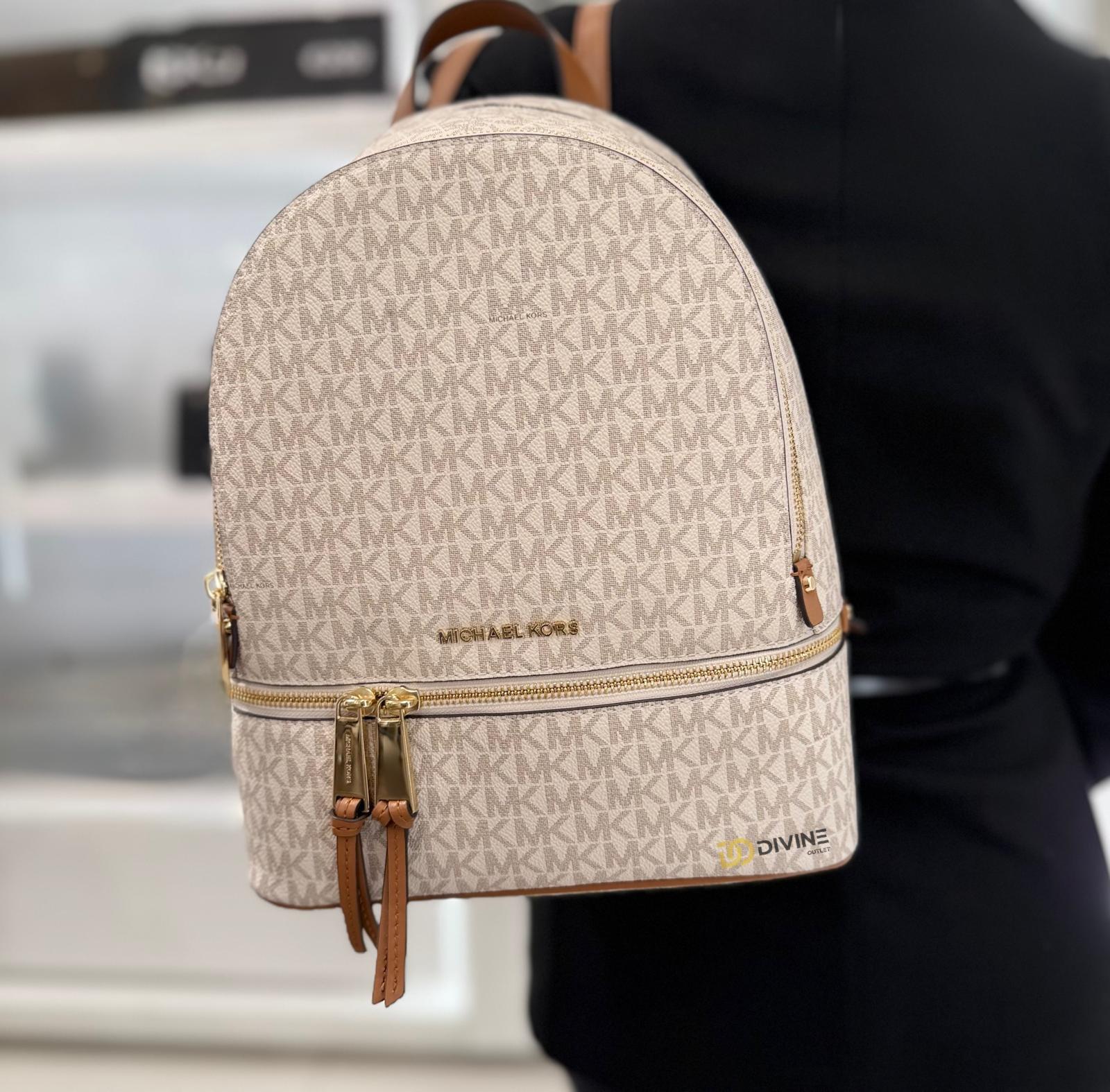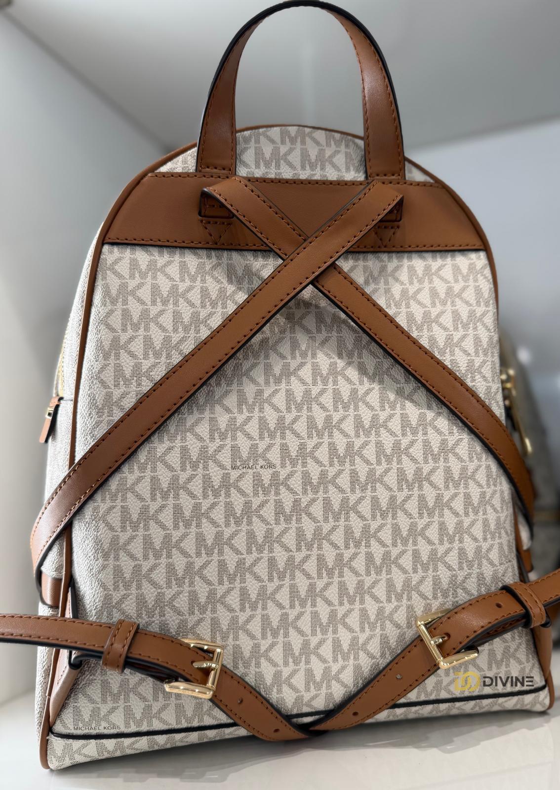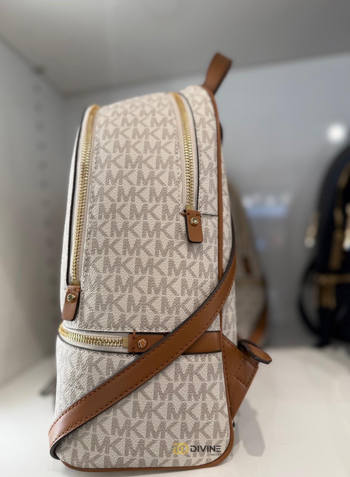 Rucsacul Michael Kors Rhea Zip Medium Vanilla combina rafinamentul feminin cu stilul practic de zi cu zi.Realizat din canvas acoperit cu imprimeu logo (adica o panza tratata special pentru a fi rezistenta si usor de curatat) si completat cu detalii din piele naturala si accesorii aurii,ofera un aer elegant si versatil.